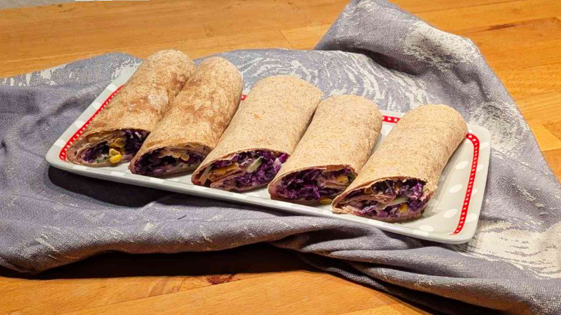Den Kohl in ganz feine Streifen schneiden und mit etwas Salz gründlich kneten, bis er weich wird. Den Thunfisch abtropfen lassen und mit Frischkäse und Kapern in einen hohen Mixbecher geben. Mit dem Pürierstab mixen und leicht mit Salz und Pfeffer abschmecken. Die Gurke in feine Viertelmonde oder Streifen schneiden und den Mais abtropfen lassen. Die Wraps in der Mikrowelle, Airfryer oder Pfanne erwärmen, jeweils ein Viertel der Thunfischcreme aufstreichen und dabei einen Rand lassen. Gemüse auf die Tortillas verteilen, jeweils eng aufrollen und schräg halbieren.